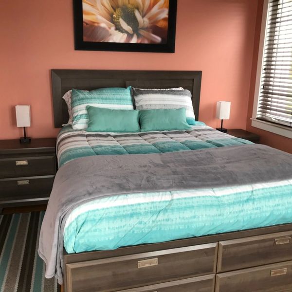Room 1 (Master): Queen platform bed with 12 drawer and a large walk in closet